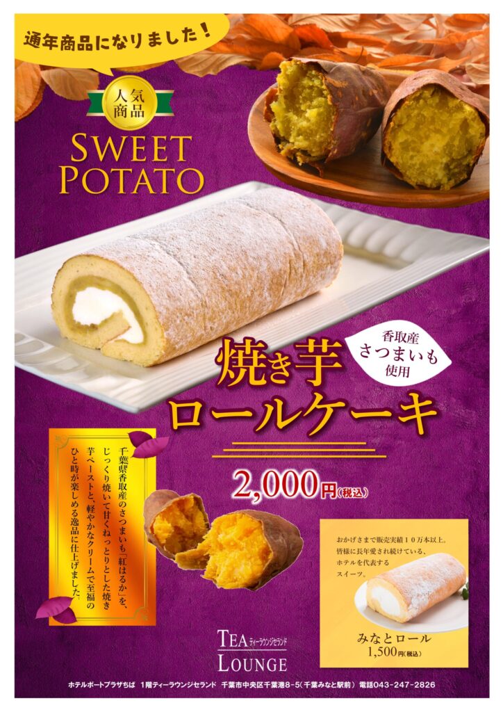 千葉県は全国有数のさつまいもの産地ということで、現在も農業産出額全国3位の規模を誇っております。千葉県の美味しいさつま芋をもっと皆様に知っていただきたい!地元千葉県のさつま芋って美味しい!その思いひとつで当ホテルパティシエ渡邊が、じっくり焼いた紅はるかを丁寧にペーストし、軽やかなクリームと合わせた自慢の逸品です。そして甘すぎず、さつま芋の風味がお口の中にふわっと広がる最高のロールケーキです。