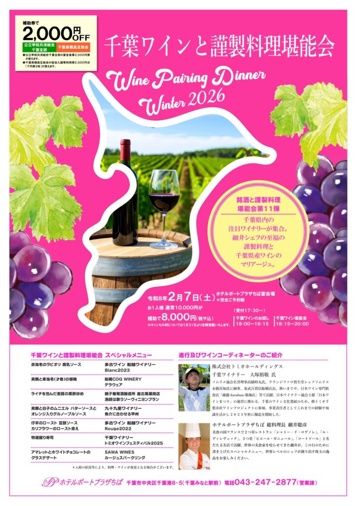 「千葉ワインと謹製料理堪能会」を開催いたします。千葉県内の注目ワイナリーが集合し、