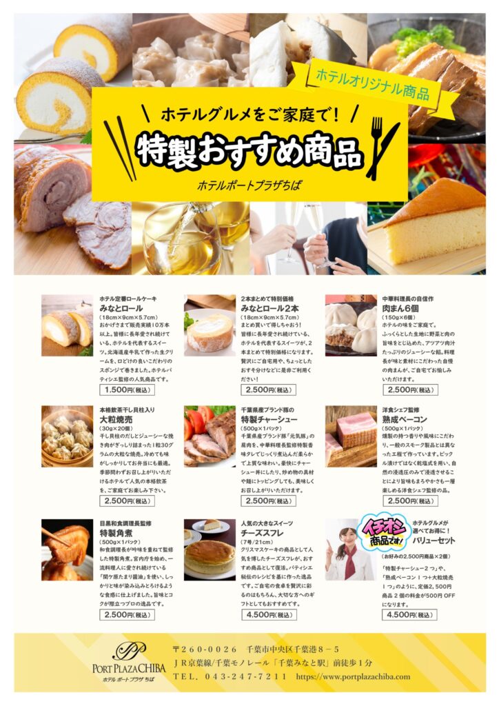 ホテルポートプラザちばの和・洋・中調理長が自信をもっておすすめする、オリジナル商品を皆様にご紹介いたします。ホテル定番商品にみなとロールや、人気商品のチャーシュー、その他数々の美味しい商品をご用意しております。令和8年度からは、セットでご購入いただくと、お買い得になるバリューセットも登場いたしました。ぜひホテルグルメをご家庭で気軽に味わっていただき、お楽しみください。